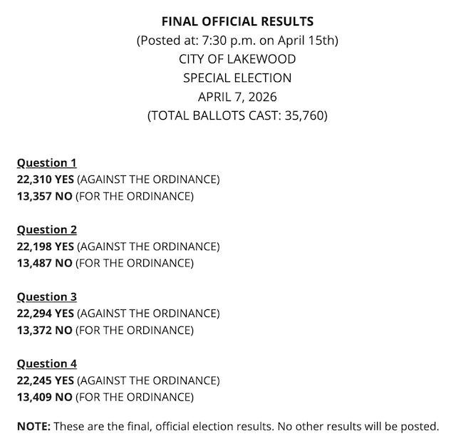FIVE OUT OF EIGHT Lakewood voters called for repeal of all four state-mandate-driven ordinance changes. (City of Lakewood)